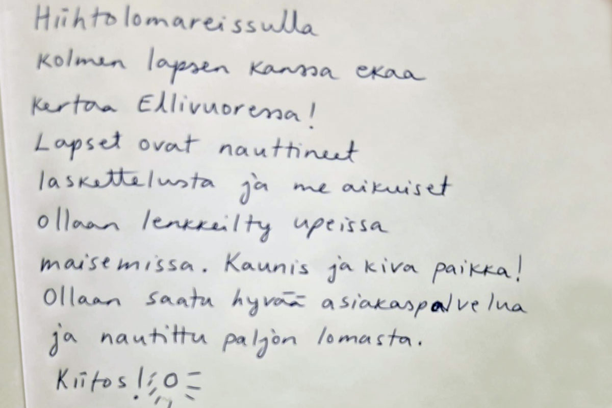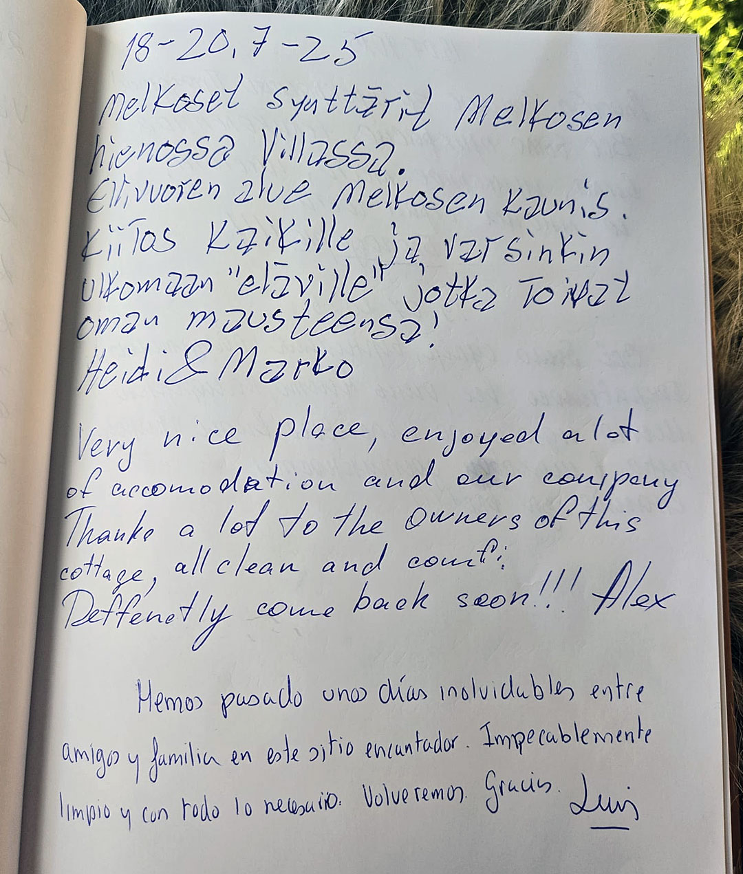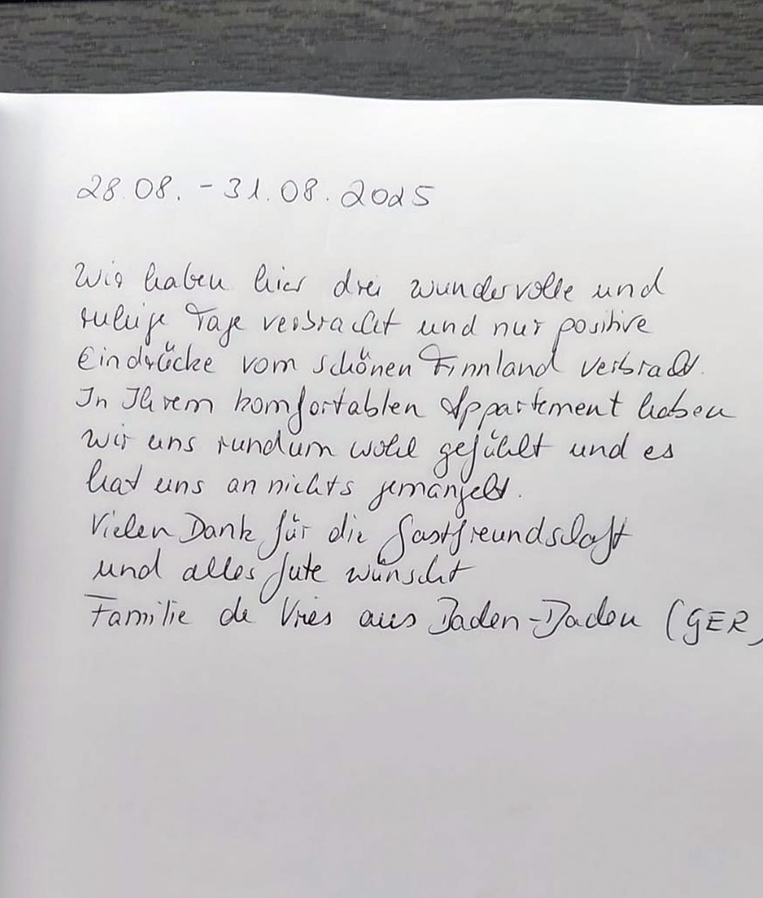 Vieraamme ovat ilahduttaneet meitä mitä lämmittävimmillä terveisillä. Vieraskirja löytyy jokaisesta huoneistostamme. Kuvagalleriasta pääset kurkkaamaan, miten vieraamme ovat meillä viihtyneet.