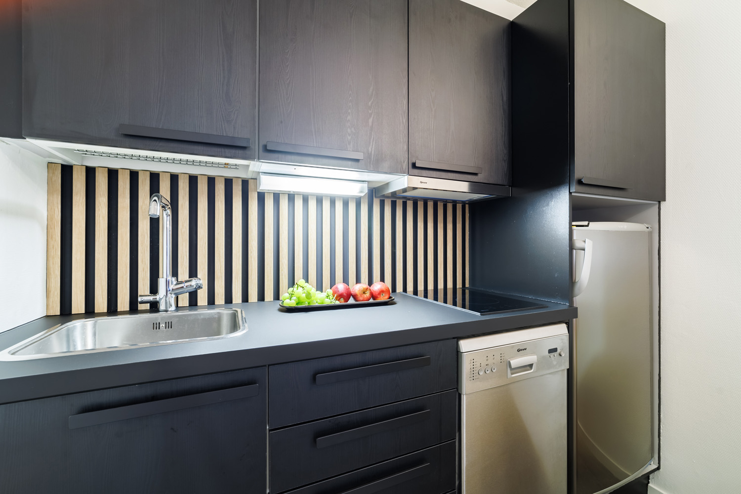 Jääkaappi, induktioliesi, mikroaaltouuni, kahvinkeitin, vedenkeitin, astiasto, ruoanlaittovälineet.
