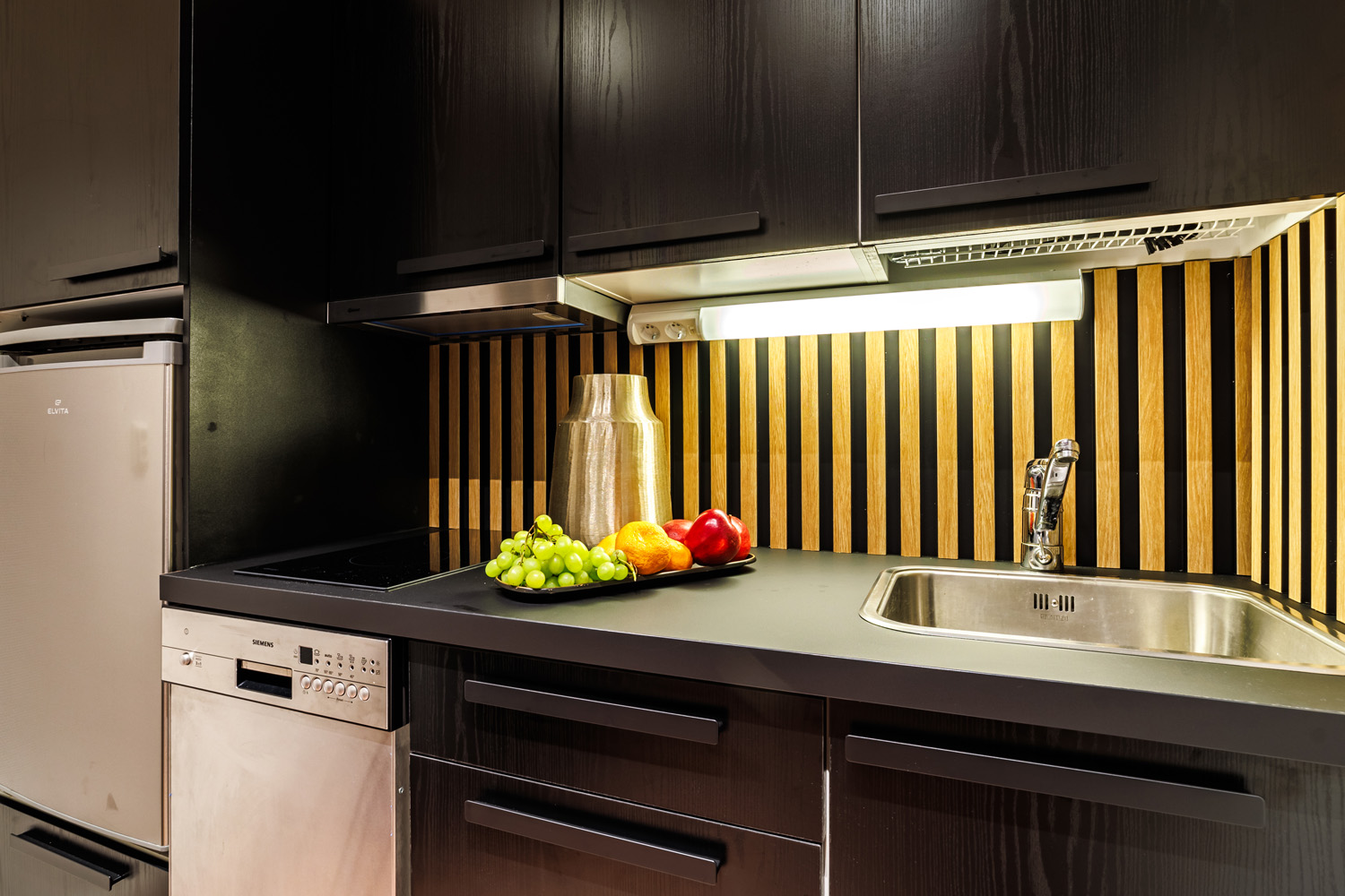 Jääkaappi, induktioliesi, mikroaaltouuni, kahvinkeitin, vedenkeitin, astiasto, ruoanlaittovälineet.
