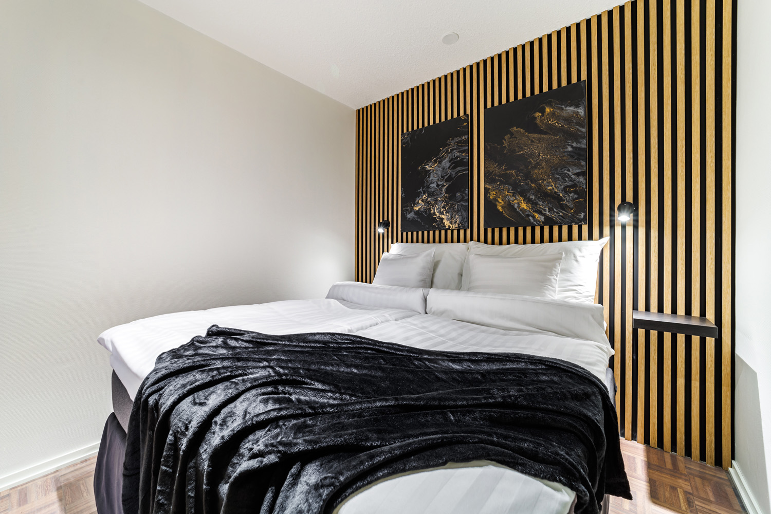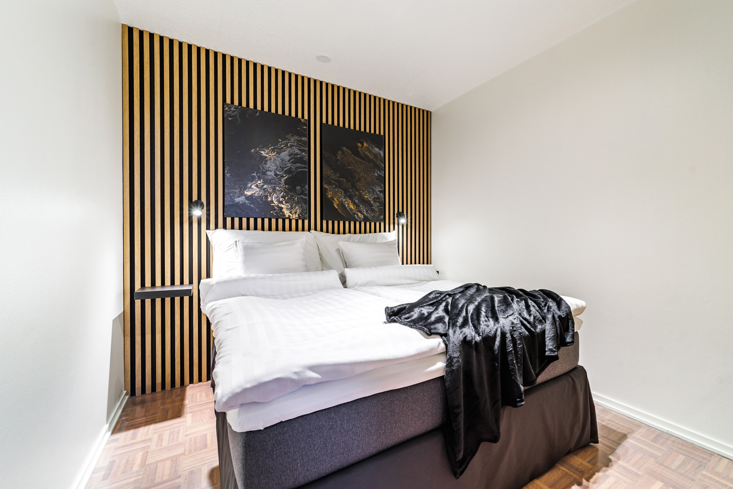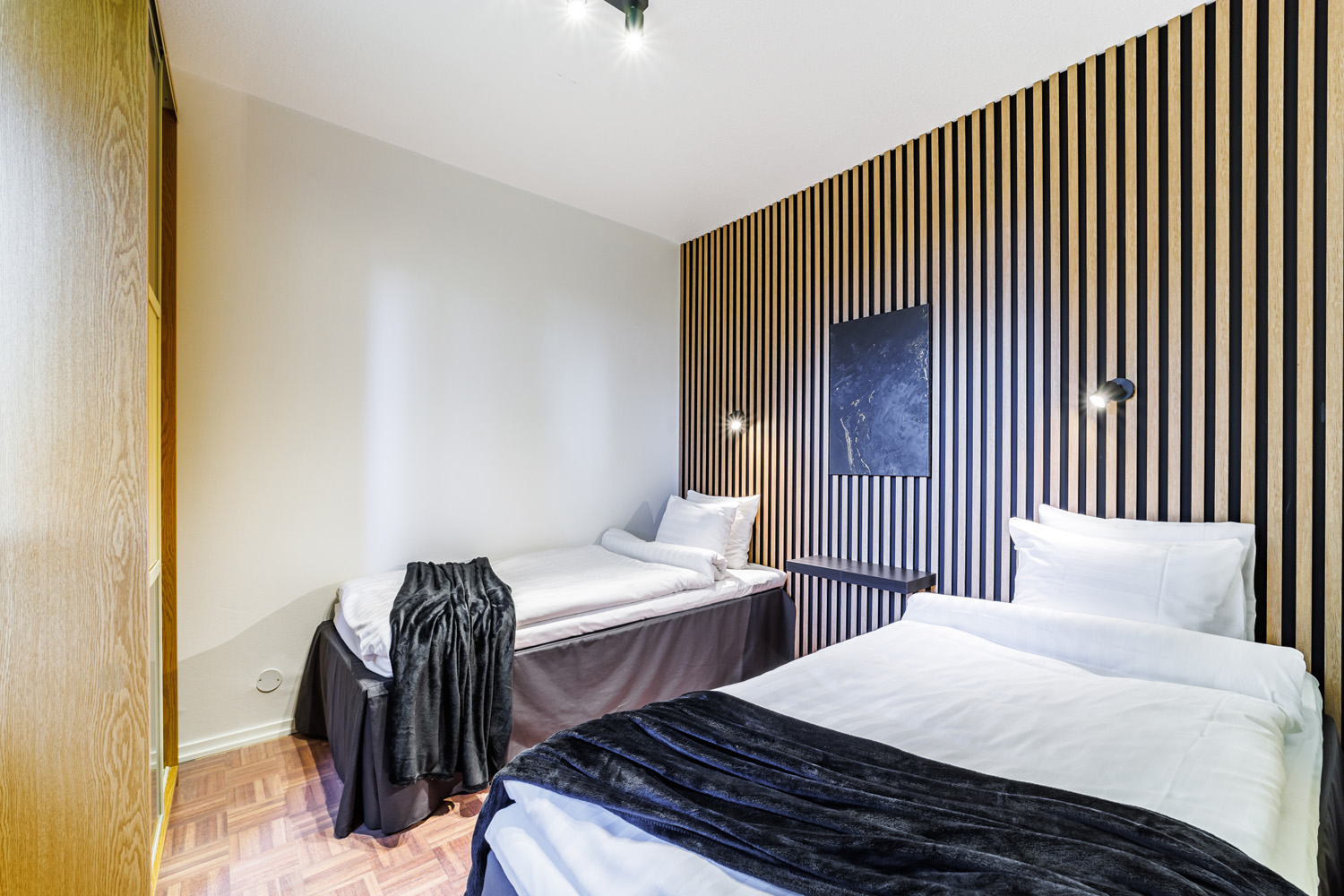 2 makuuhuonetta, toisessa ylellinen parivuode, toisessa erillisvuoteet.