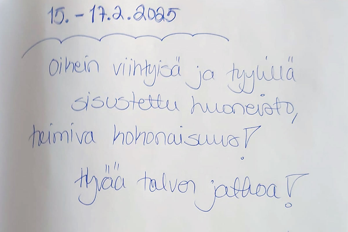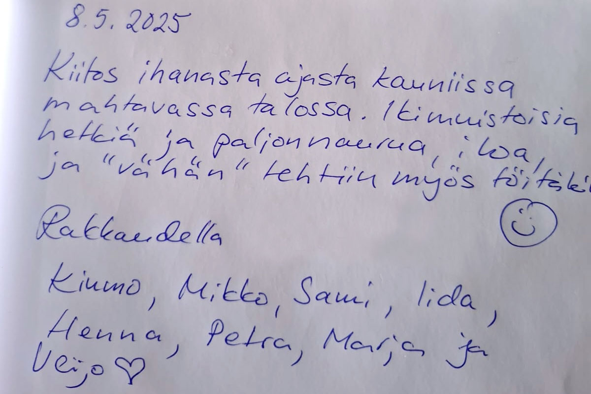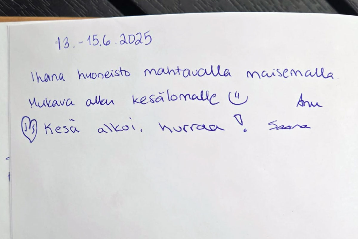 Vieraamme ovat ilahduttaneet meitä mitä lämmittävimmillä terveisillä. Vieraskirja löytyy jokaisesta huoneistostamme. Kuvagalleriasta pääset kurkkaamaan, miten vieraamme ovat meillä viihtyneet.